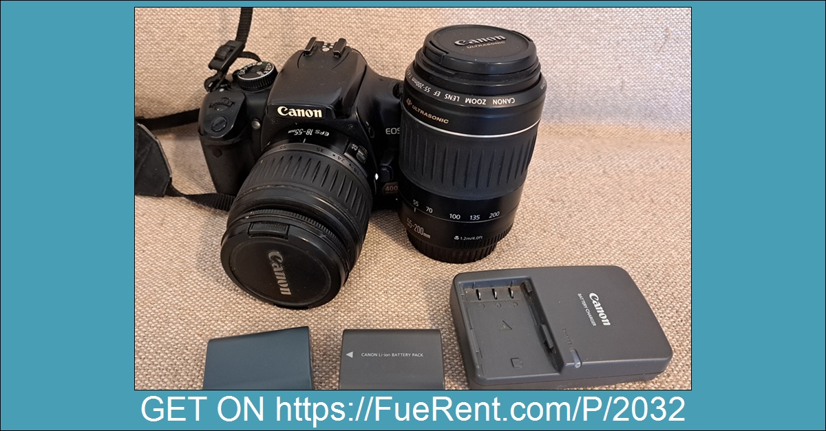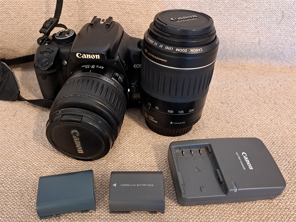 Full kit of Canon 400D, with 18-55mm standard lens and 55-200mm tele lens, two batteries and charger.