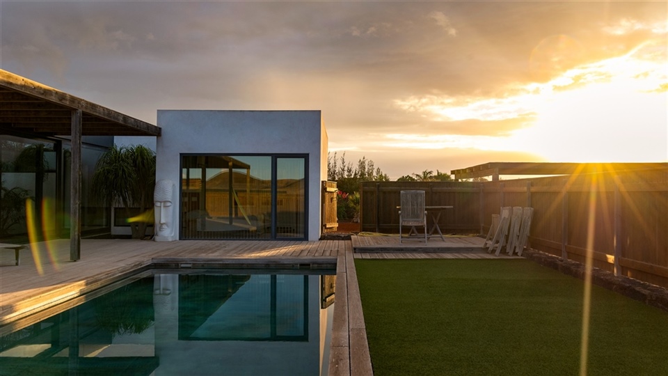 VIP Suite from Racer's Hive event location. Double bed, private bathroom, shared pool, kitchen, patio, covered parking space.